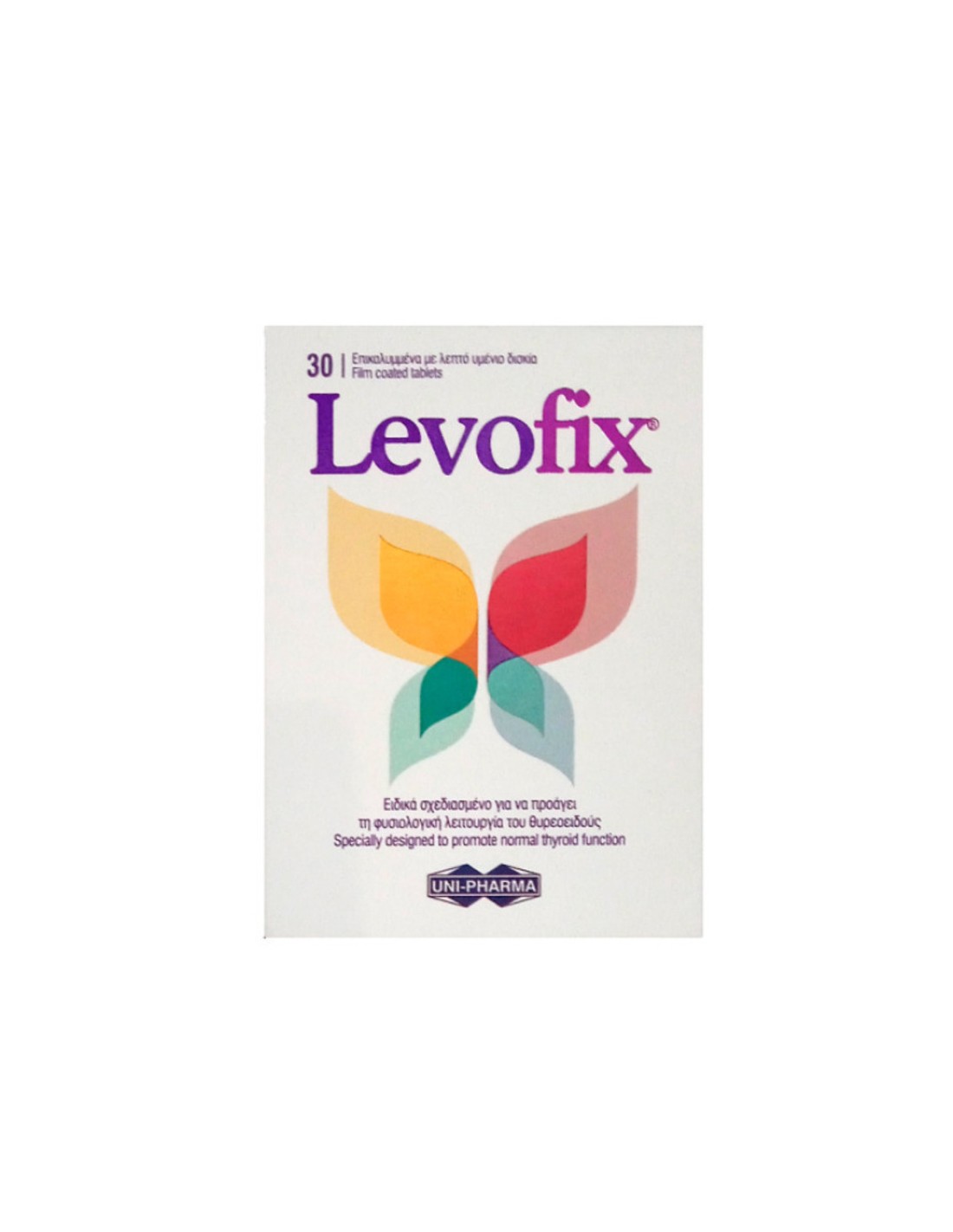 Συμπλήρωμα διατροφής ειδικά σχεδιασμένο για να προάγει τη φυσιολογική λειτουργία του θυροειδούς. Χάρη στη σύνθεσή του (χαμηλής περιεκτικότητας σε σάκχαρα) με φυτικά εκχυλίσματα, βιταμίνες (Β2, Β6, Β9, Β12, C, D και E) και μέταλλα, το Levofix από τη Uni-Pharma συμβάλλει στην παραγωγή θυρεοειδικών ορμονών και βοηθούν την θυρεοειδική λειτουργία.
